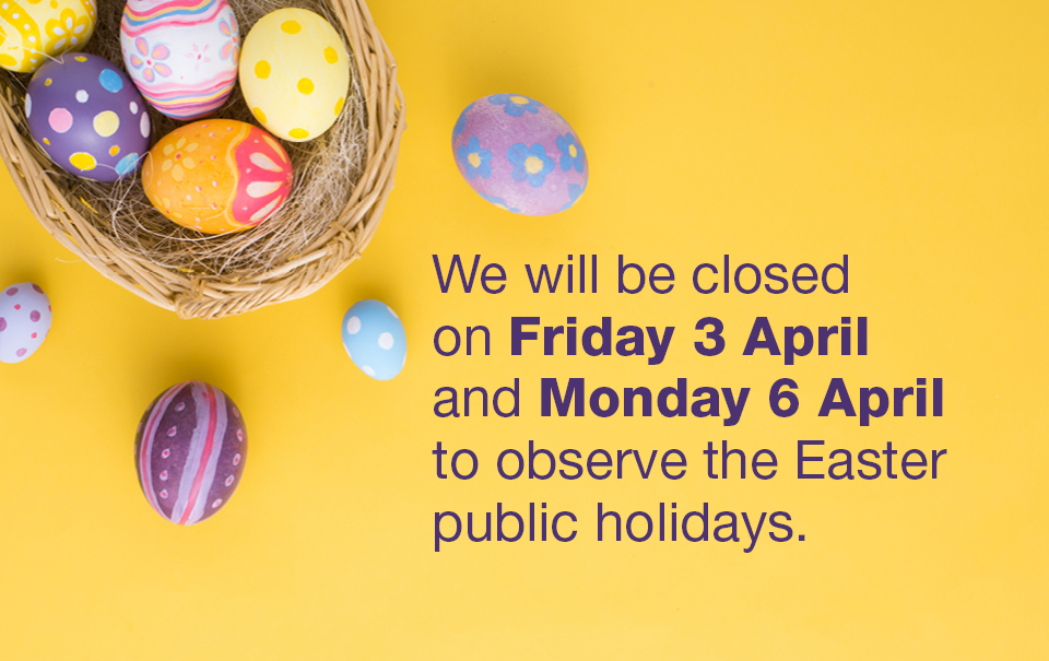 All our library branches will be closed on Friday 3 April and Monday 6 April to observe the Easter public holidays.